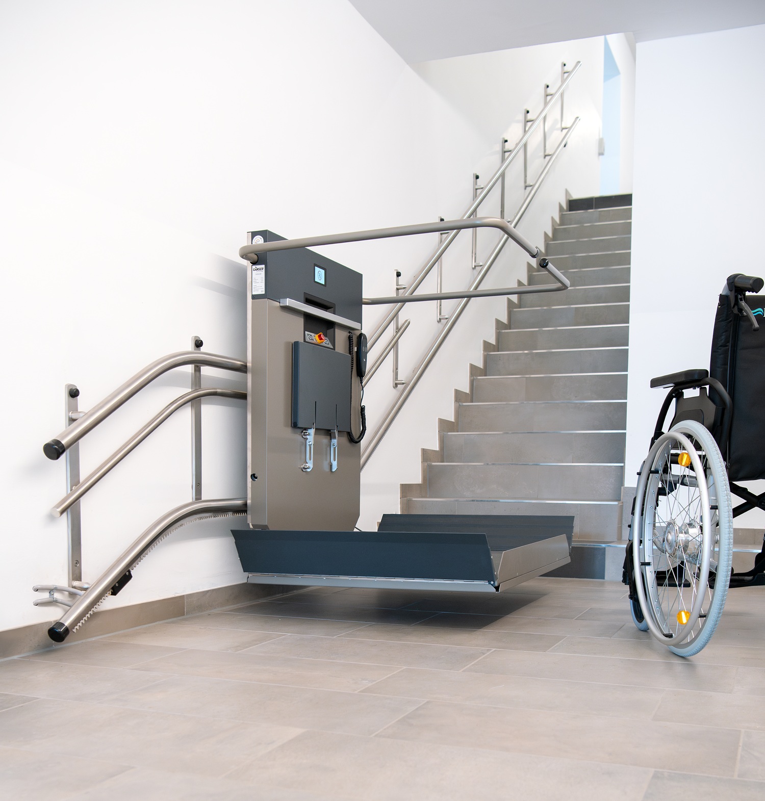 Kurviger Plattformlift mit Display und Sprachausgabe