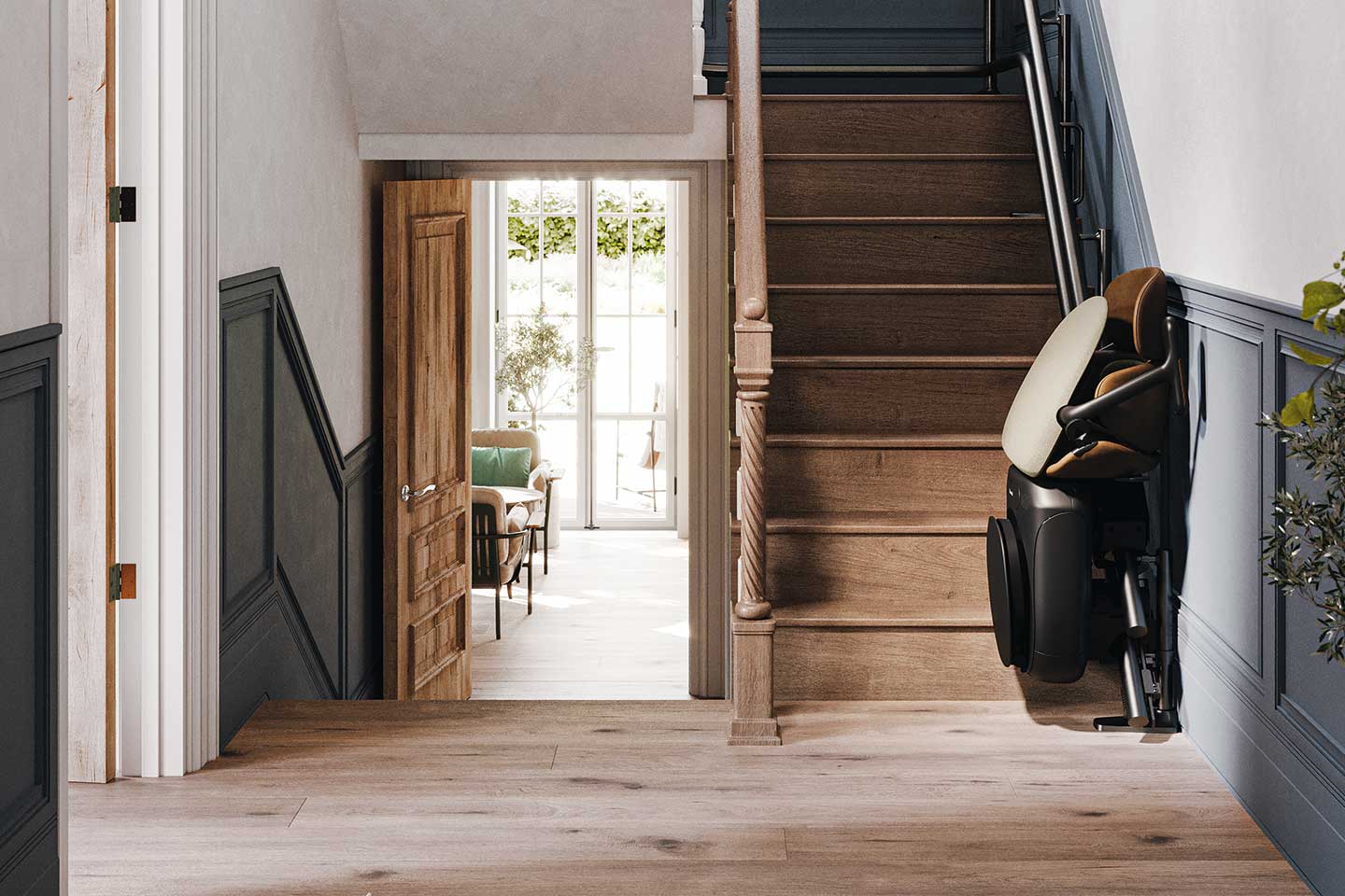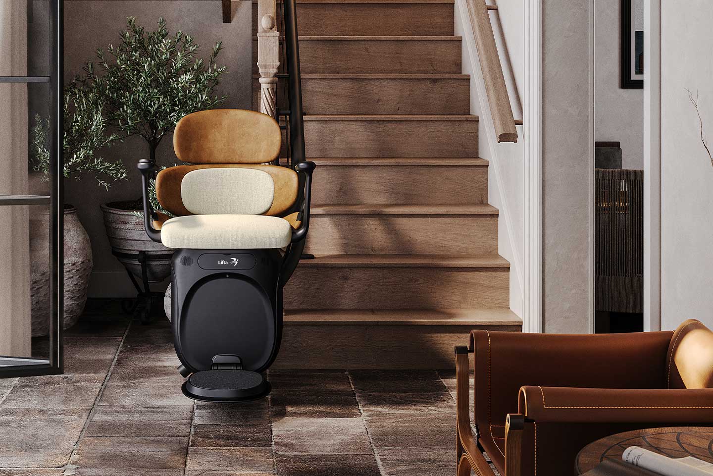 Der Lifta Luxor fügt sich harmonisch in Ihr Wohnumfeld ein. Die schlanke Schiene und der kompakte Sitz wirken zurückhaltend und elegant statt technisch.