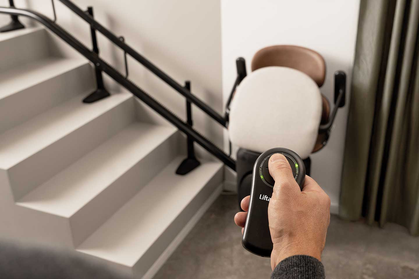Mit der handlichen Fernbedienung steuern Sie den Lifta Luxor einfach und sicher. Ein Tastendruck genügt, um den Lift zu bewegen, egal ob er nach oben oder nach unten fahren soll.